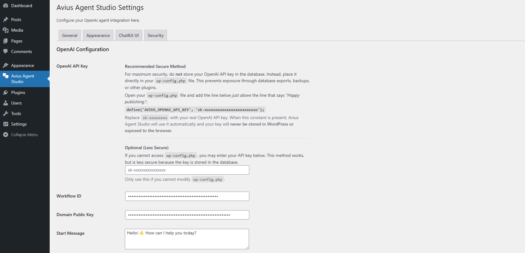 Avius Agent Studio is a professional-grade WordPress integration plugin designed to connect OpenAI Agent Builder workflows directly into your website using ChatKit. It transforms WordPress into a fully interactive AI assistant platform with advanced UI customization, secure session management, and flexible display controls.